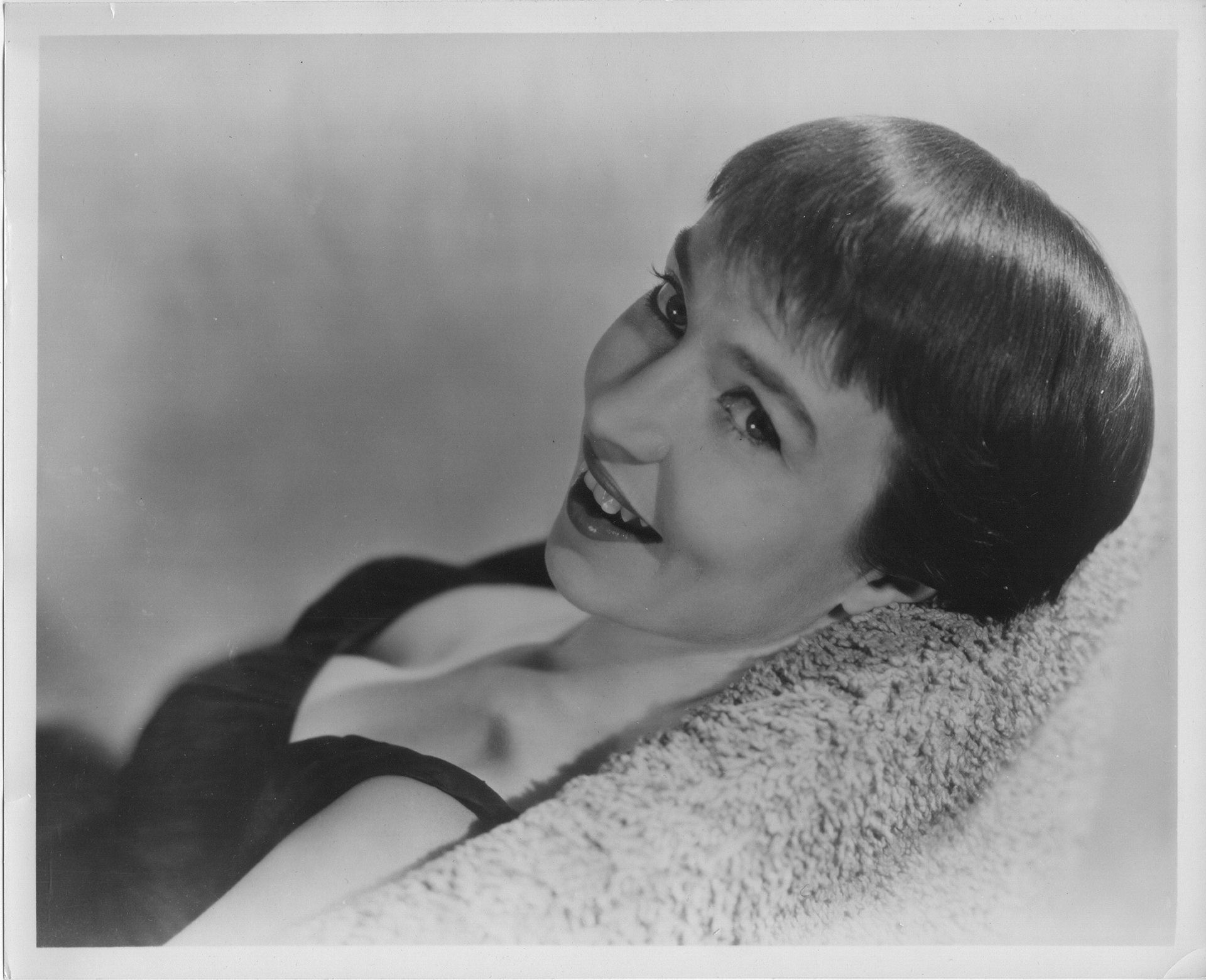 1957 Helen Publicity photo, black strap, reclining, looking over shoulder, bw, 8×10