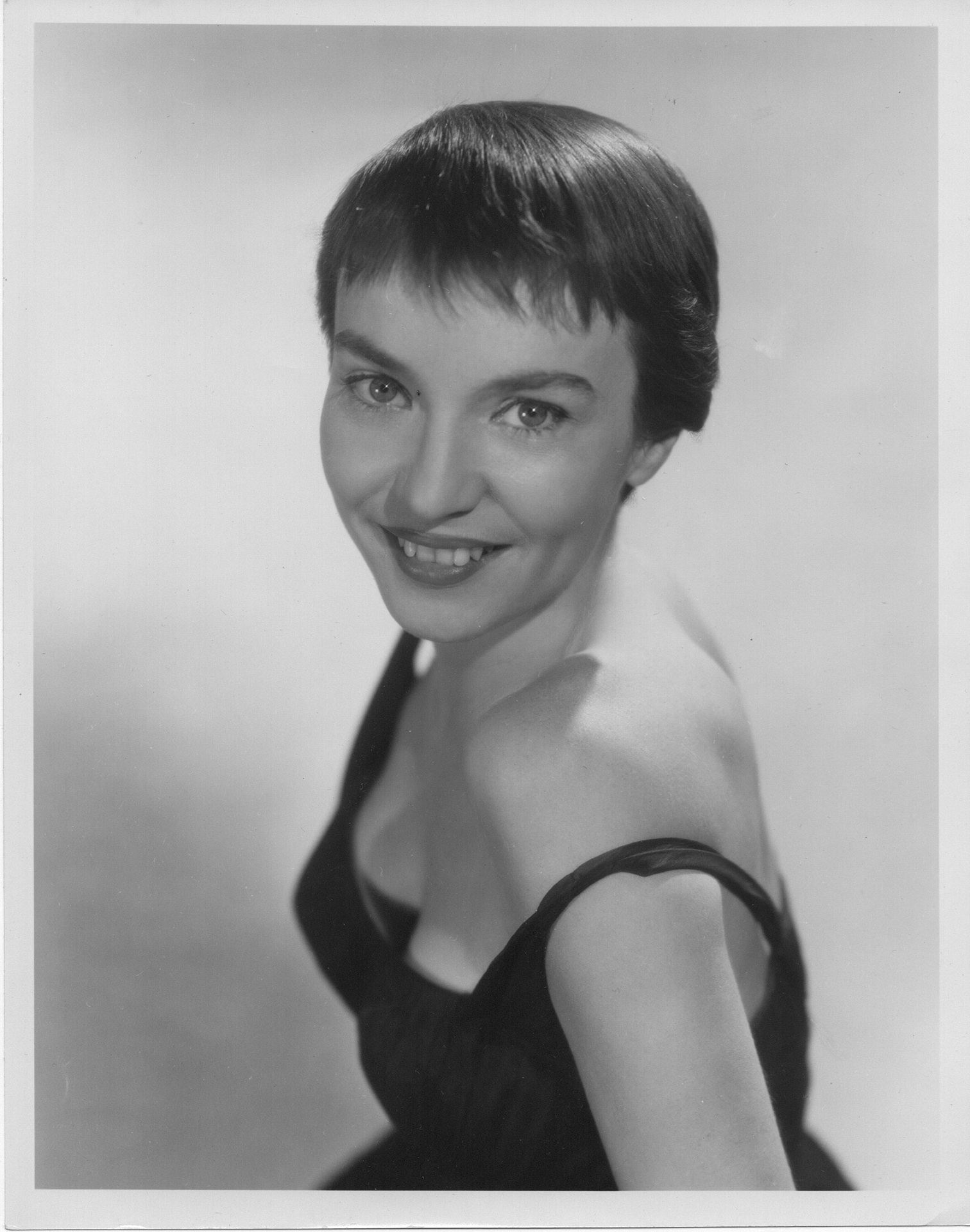 1957 Helen Publicity photo, black strap, looking over shoulder, bw, 8×10